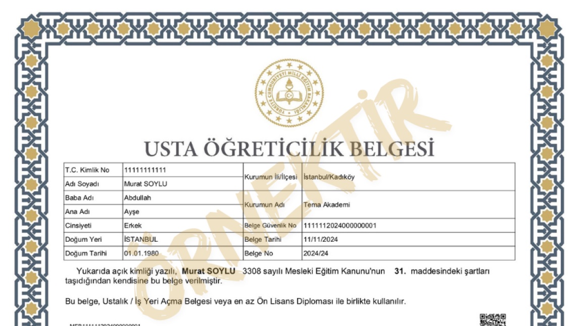 Ustalık/işyeri açma belgesine, dört yılık mesleki ve teknik ortaöğretim kurumu diplomasına veya en az ön lisans diplomasına sahip olanlar, okul ve kurumlarca açılan iş pedagojisi kursuna katılabilirler. İş pedagojisi kursu uzaktan eğitim yolu ile de düzenlenebilir ve sınavları e-Sınav şeklinde yapılabilir. Kursu başarı ile tamamlayanlara usta öğreticilik belgesi verilir. Usta öğreticilik belgesi; ustalık/işyeri açma belgesi, dört yılık mesleki ve teknik ortaöğretim kurumu diploması veya en az ön lisans diploması ile birlikte kulanılır.